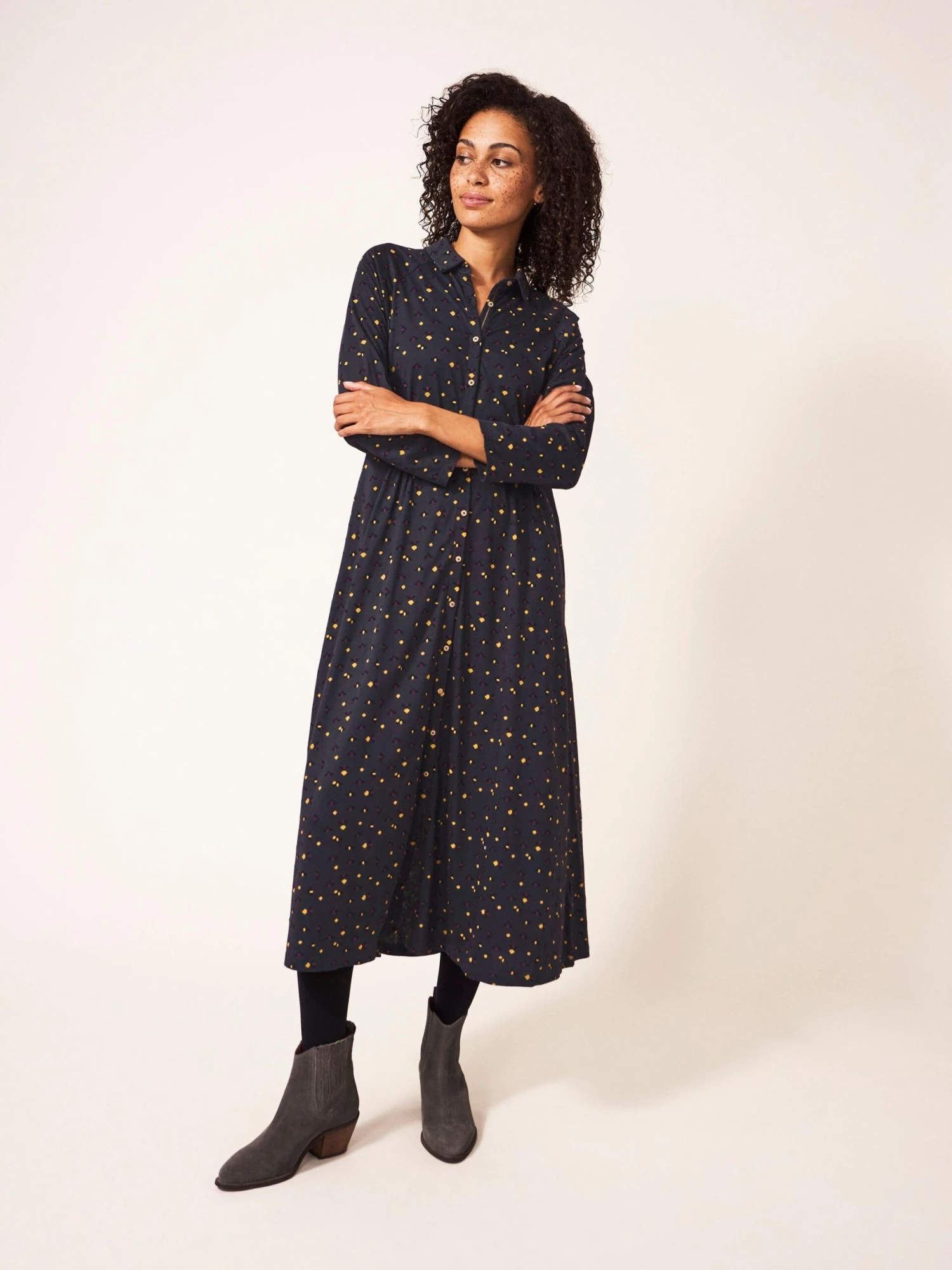 A long shirt dress crafted in a blend of modal and organic cotton fabrics. Swishy modal: Activated. 52% Modal, 48% Organic Cotton Size 12 high shoulder neck point to hem approx. 120cm Collar Long Sleeve Classic Fit Midi Machine Washable