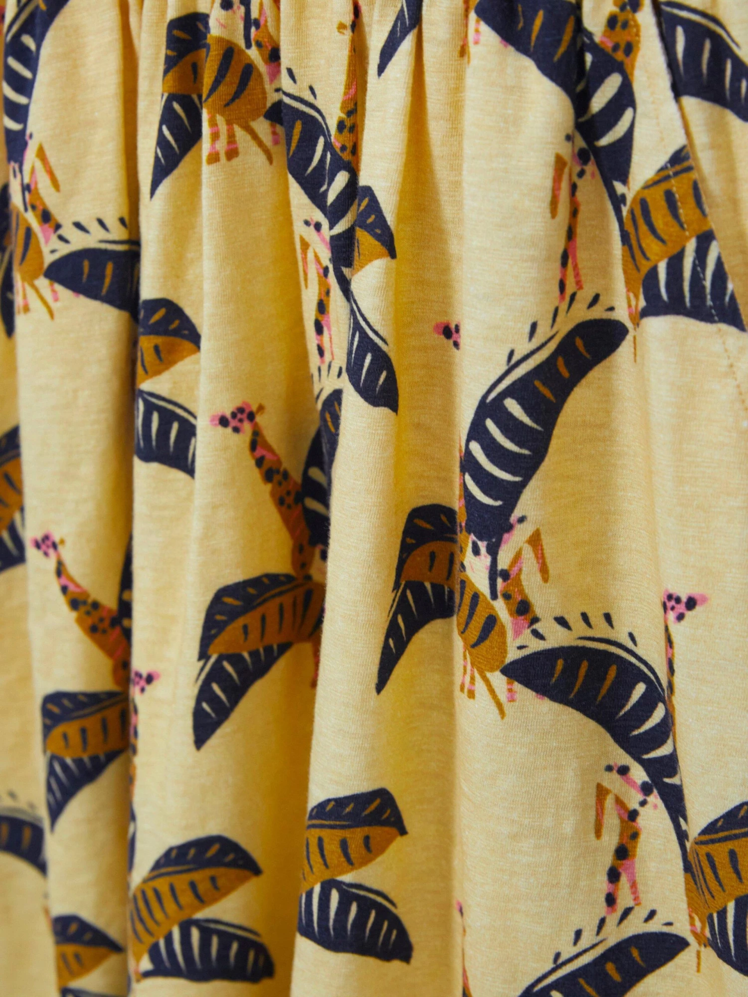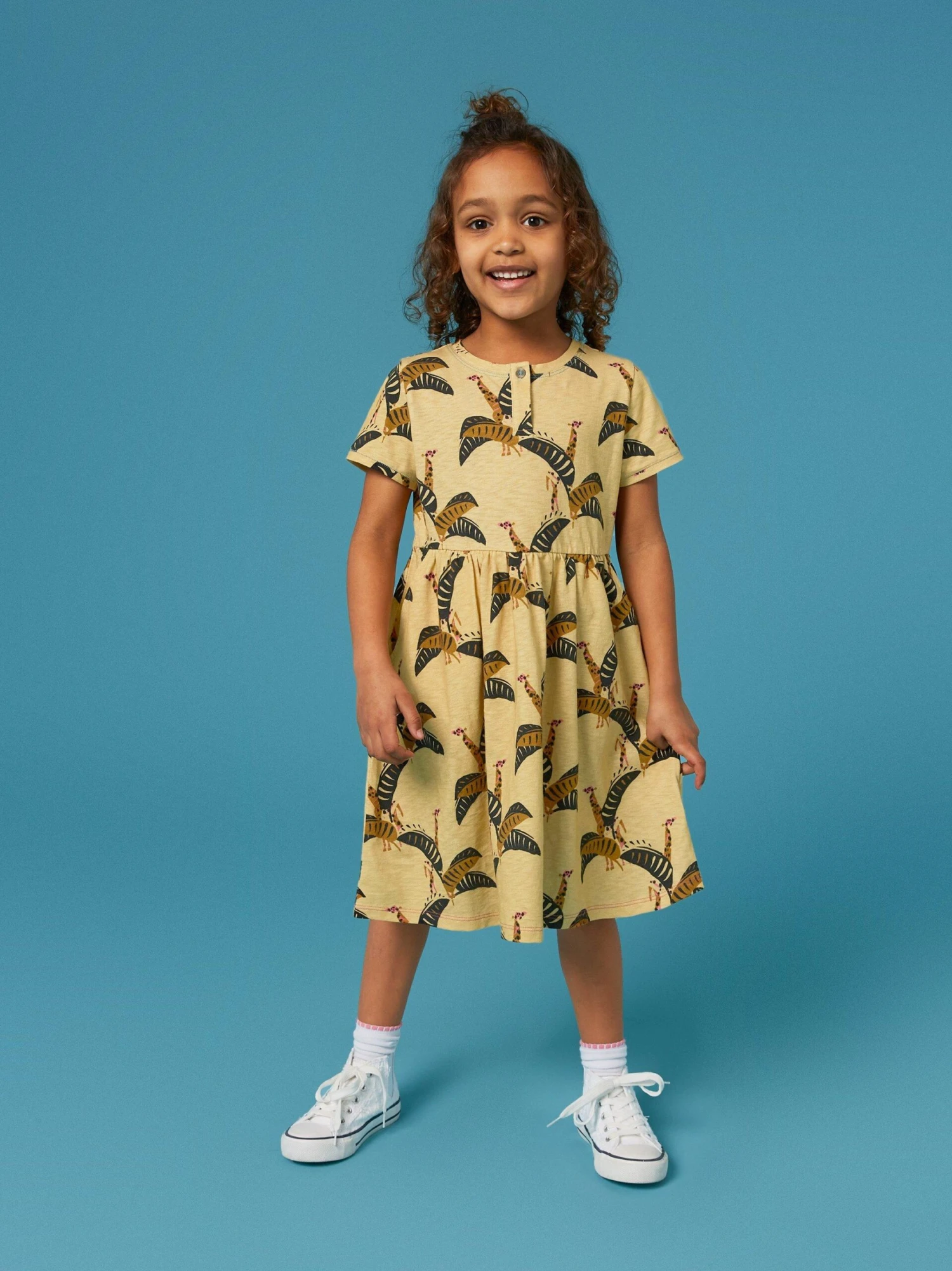 An abstract giraffe print dress made from soft 100% cotton. Summer style? Not a tall order. 100% fairtrade cotton Age 5-6 high shoulder neck point to hem approx. 65cm Crew Neck Short Sleeve Above Knee Machine Washable