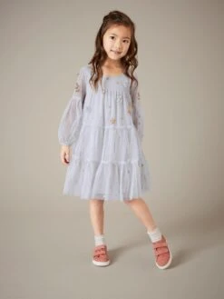 Lightweight chambray frills. Smocking. Adorable embroidery. We don’t think this dress could get any more summery. Body: 100% cotton; Embroidery; 100% polyester Age 5-6 high shoulder neck point to hem approx. 64.0cm Crew Neck Sleeveless Knee length Machine Washable