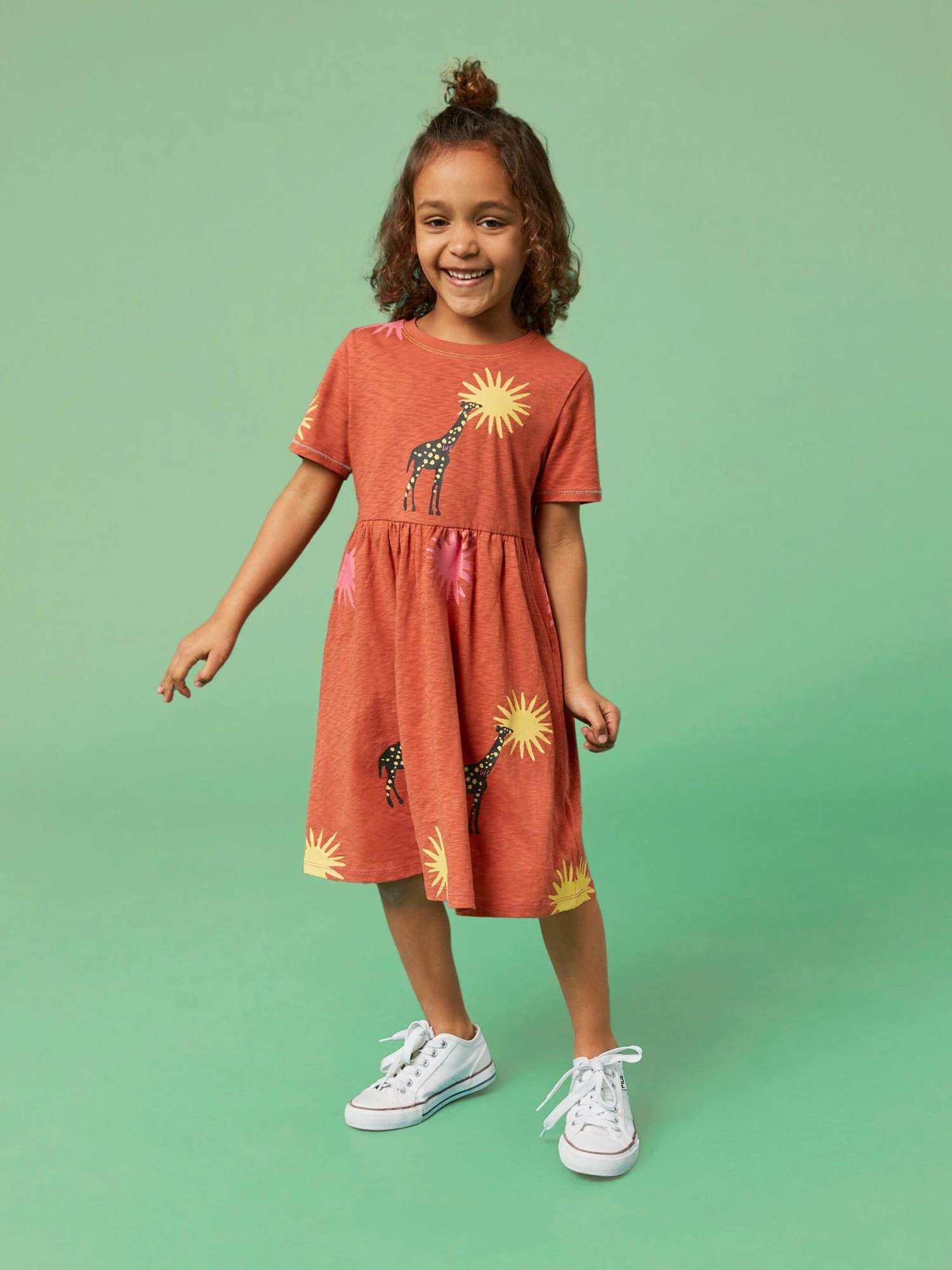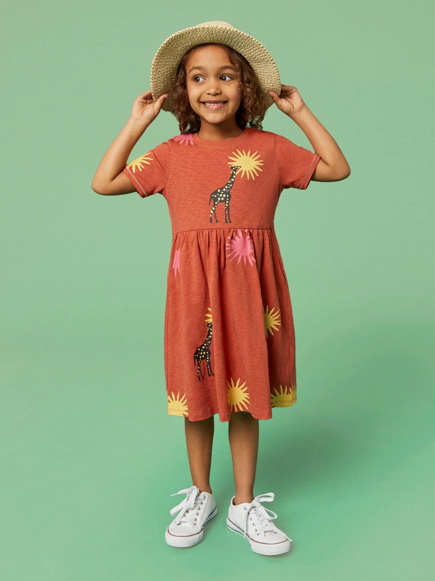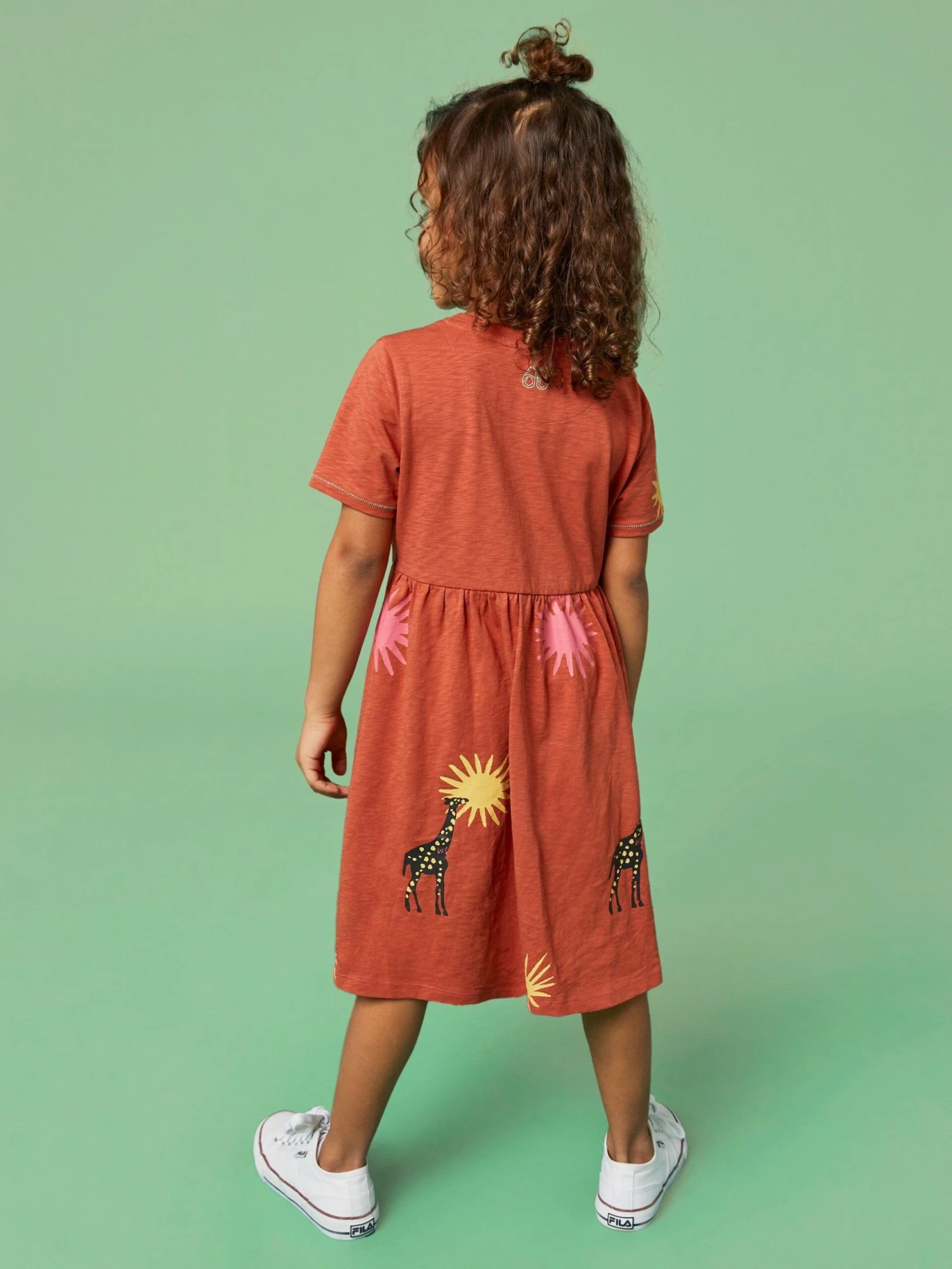 We love the orange-y red sunset hue of this giraffe-printed dress. And they will too, which is probably more important. 100% fairtrade cotton Age 5-6 high shoulder neck point to hem approx. 45.5cm Crew Neck Short Sleeve Knee length Machine Washable