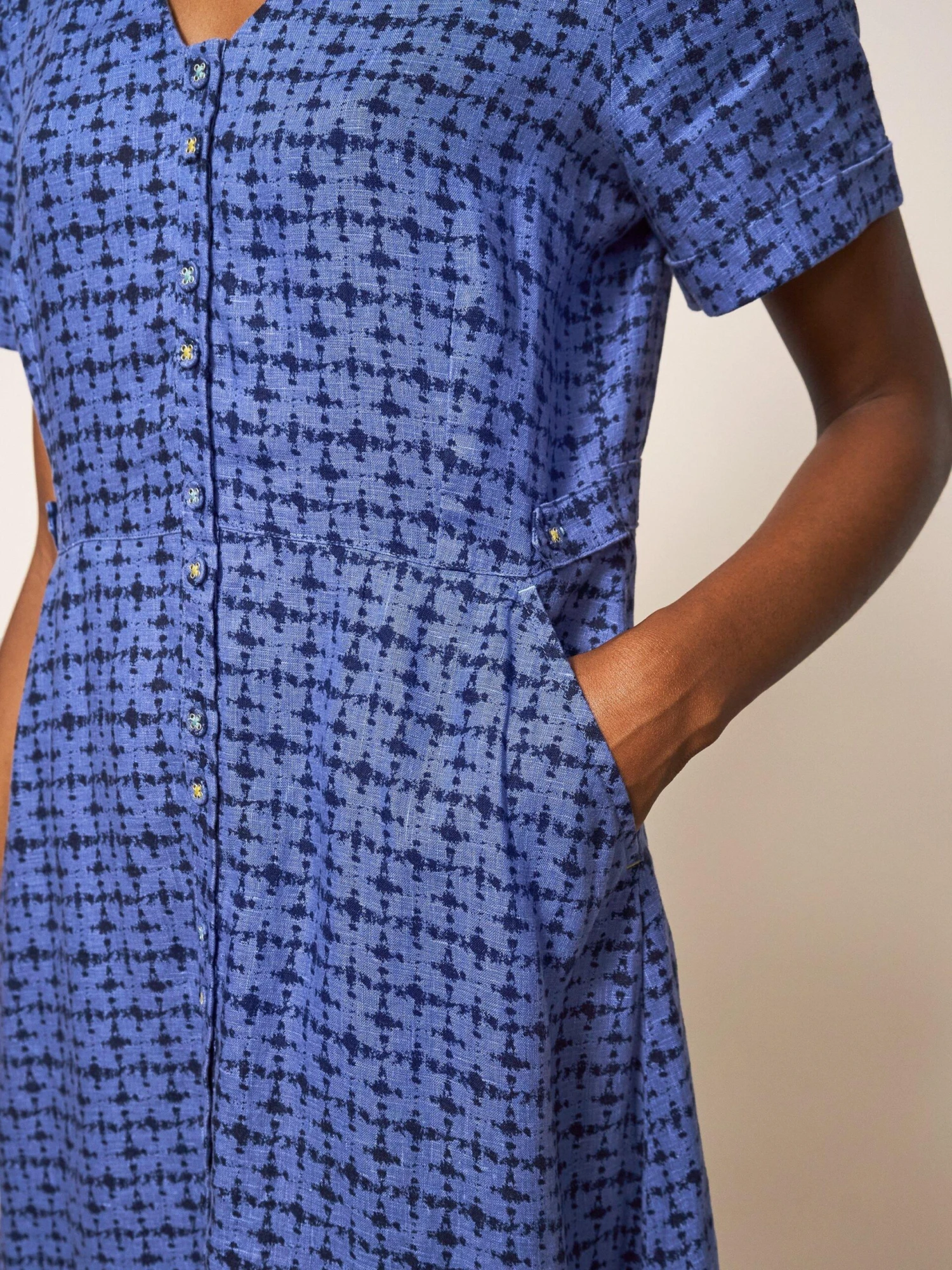 A picnic-perfect button up midi dress in a cool cotton and linen blend. Summer wardrobe? Check. 100% Linen 115cm V Neck Short Sleeve Classic Fit Midi Machine Washable