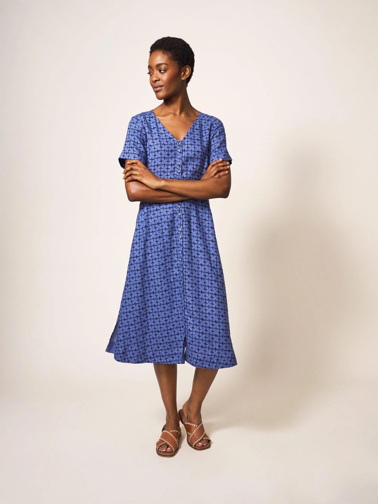 WHITE STUFF Ivy Linen Midi Dress In BLUE MULTI