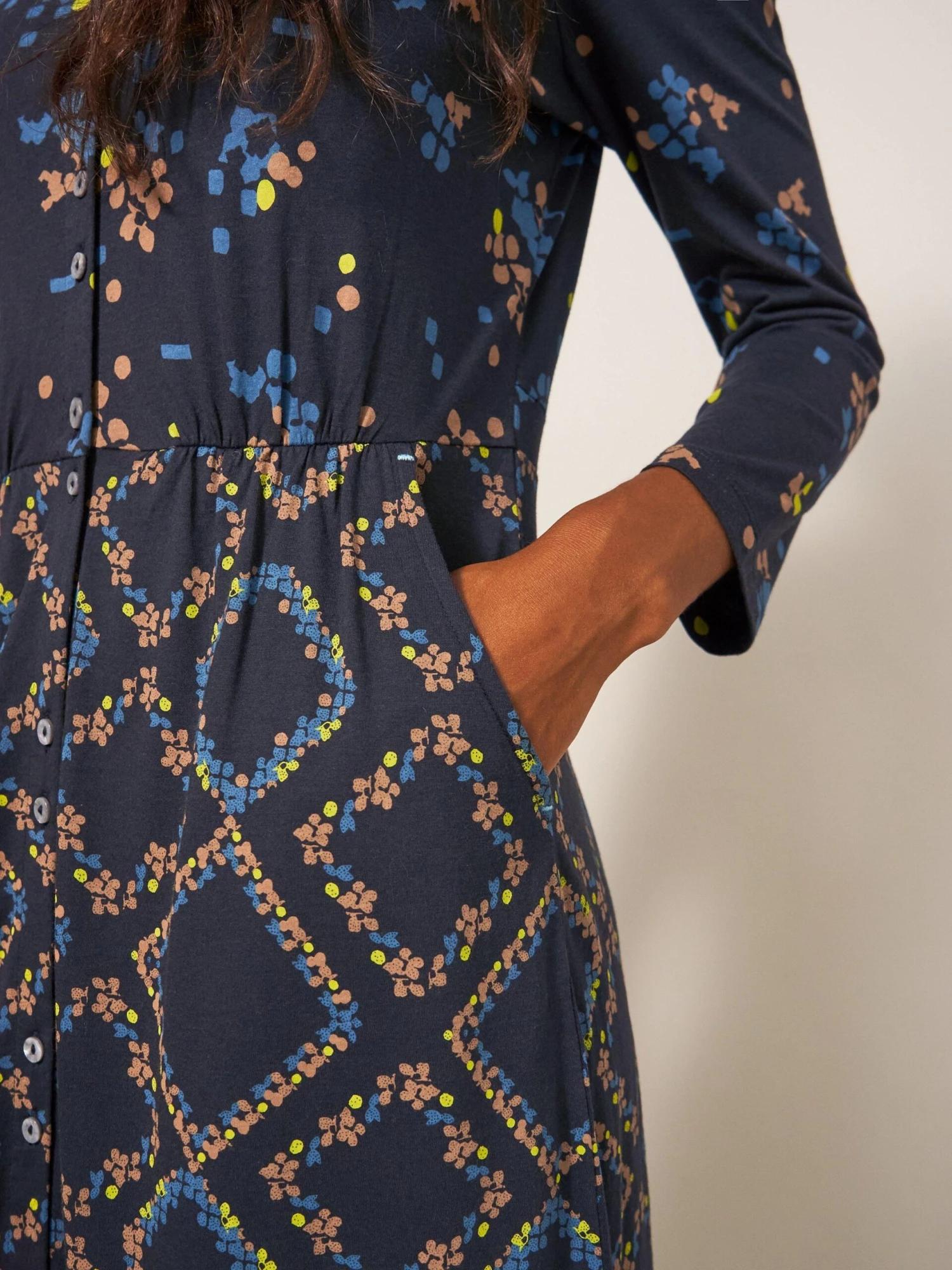 Soft jersey, a lovely print, pockets and a v-neck. These are a few of our favourite things. 51% Modal 49% Organic Cotton Size 12 high shoulder neck point to hem approx. 115 cm V Neck Long Sleeve Regular fit Midi Machine Washable