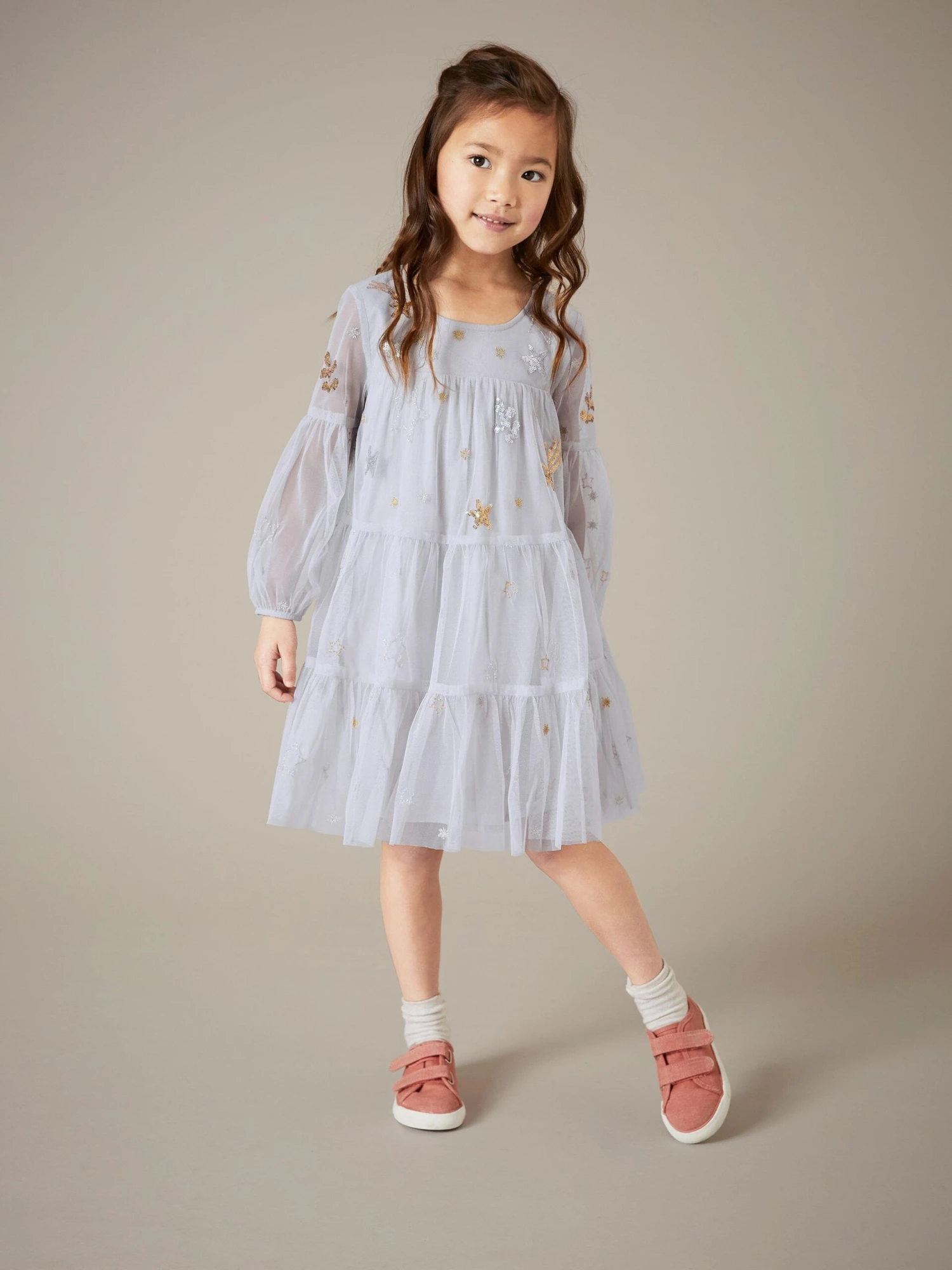 A pretty tulle dress with intricate star embroidery. Ending in tiers isn’t so bad after all. Main: 100% Polyester, Lining: 100% Cotton Age 5-6 high shoulder neck point to hem approx. 65cm Round Neck 3u002F4 Sleeve Above Knee Machine Washable