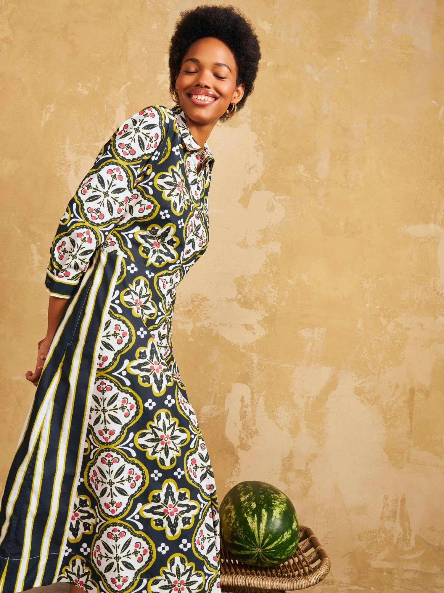 A big print. A bold dress. A glass of something fizzy and an actually tasty hors d’oeuvre in your hand. Summer’s all yours. 100% Cotton Size 12 high shoulder neck point to hem approx. 120 cm Collar 3u002F4 Sleeve Classic Fit Midi Machine Washable