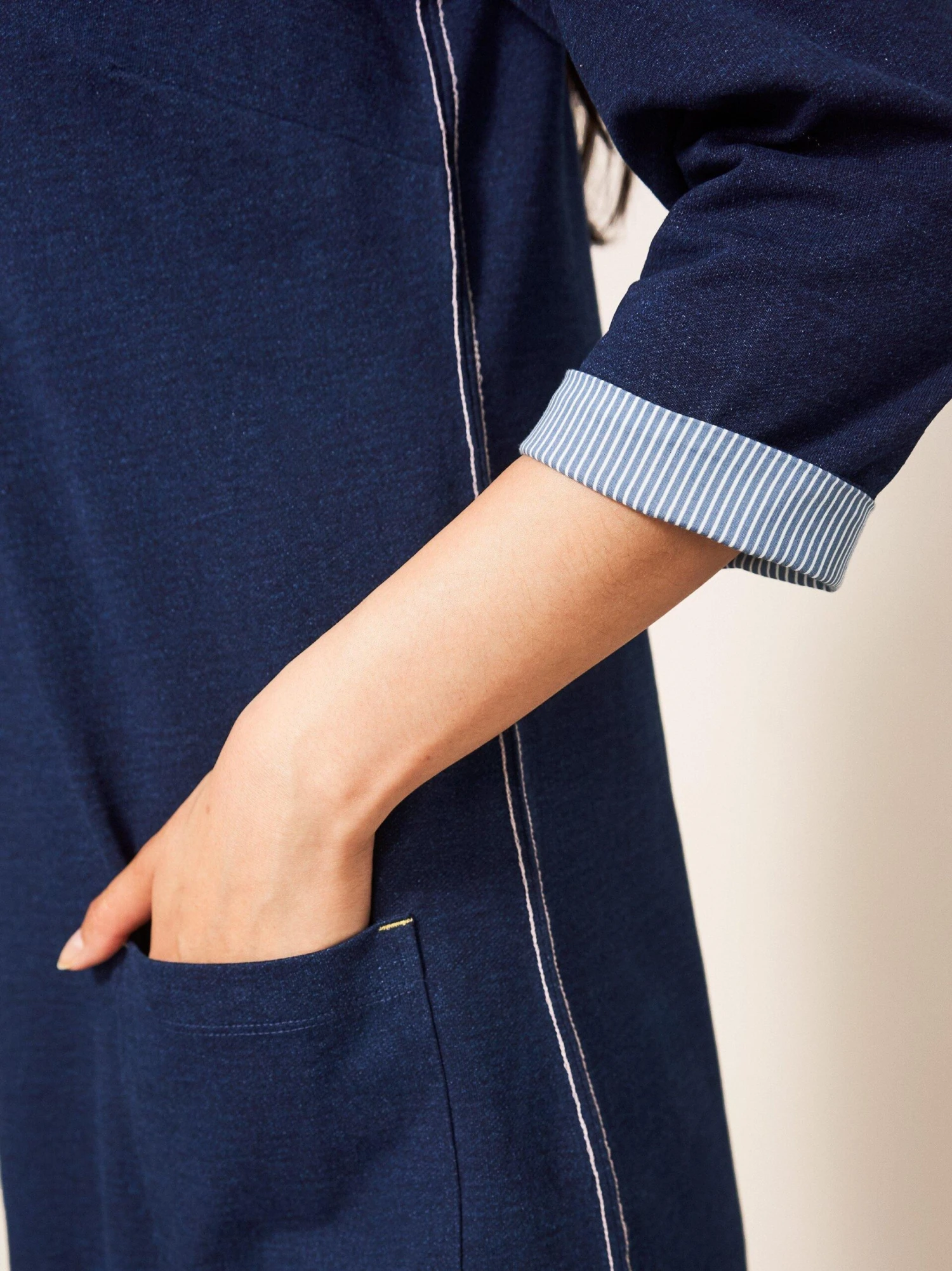 A cotton denim jersey dress with three-quarter length sleeves. Versatile, everyday dressing? Get a shift on. 79% Cotton, 14% Polyester, 7% Elastane Size 12 high shoulder neck point to hem approx. 96cm Crew Neck 3u002F4 Sleeve Classic Fit Knee length Machine Washable