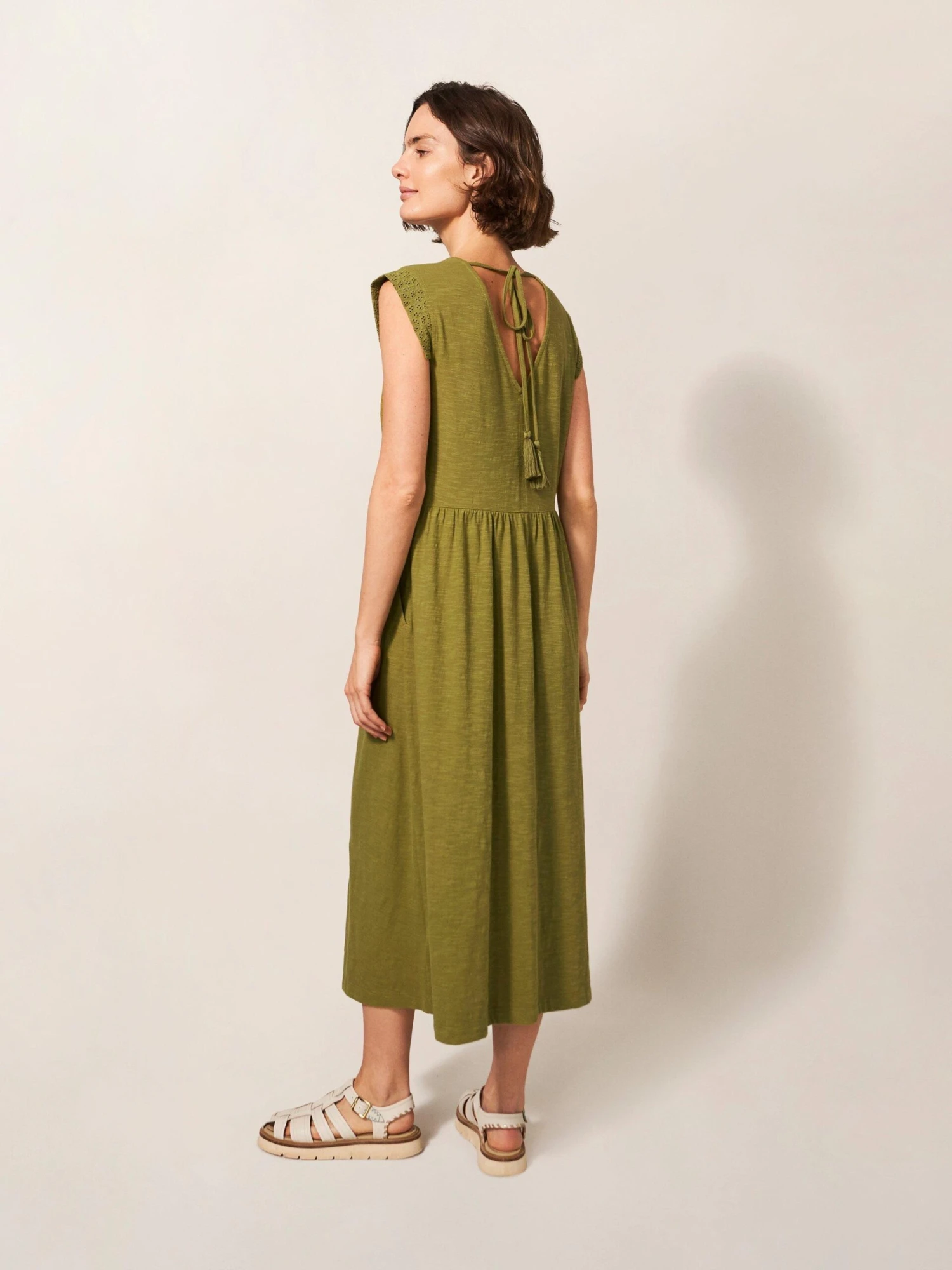 WHITE STUFF Violet Jersey Broderie Dress In MID GREEN